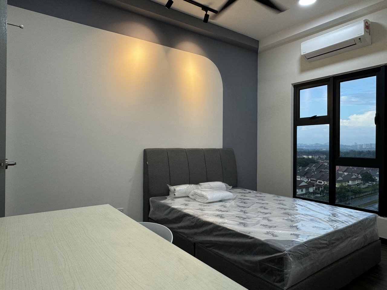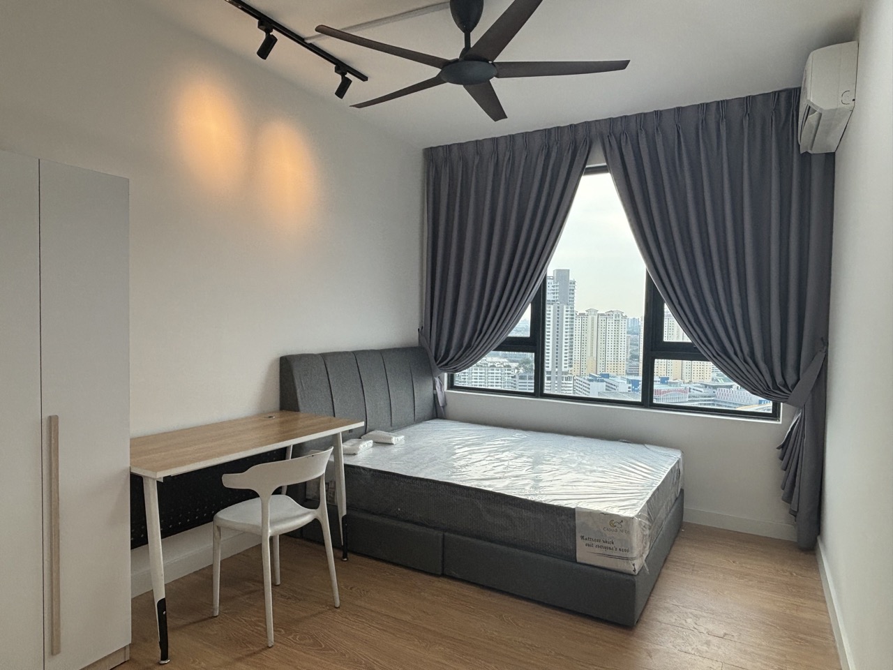 Brand-new furniture, bedframe, mattress, table, chair, air-cond, curtain & so on